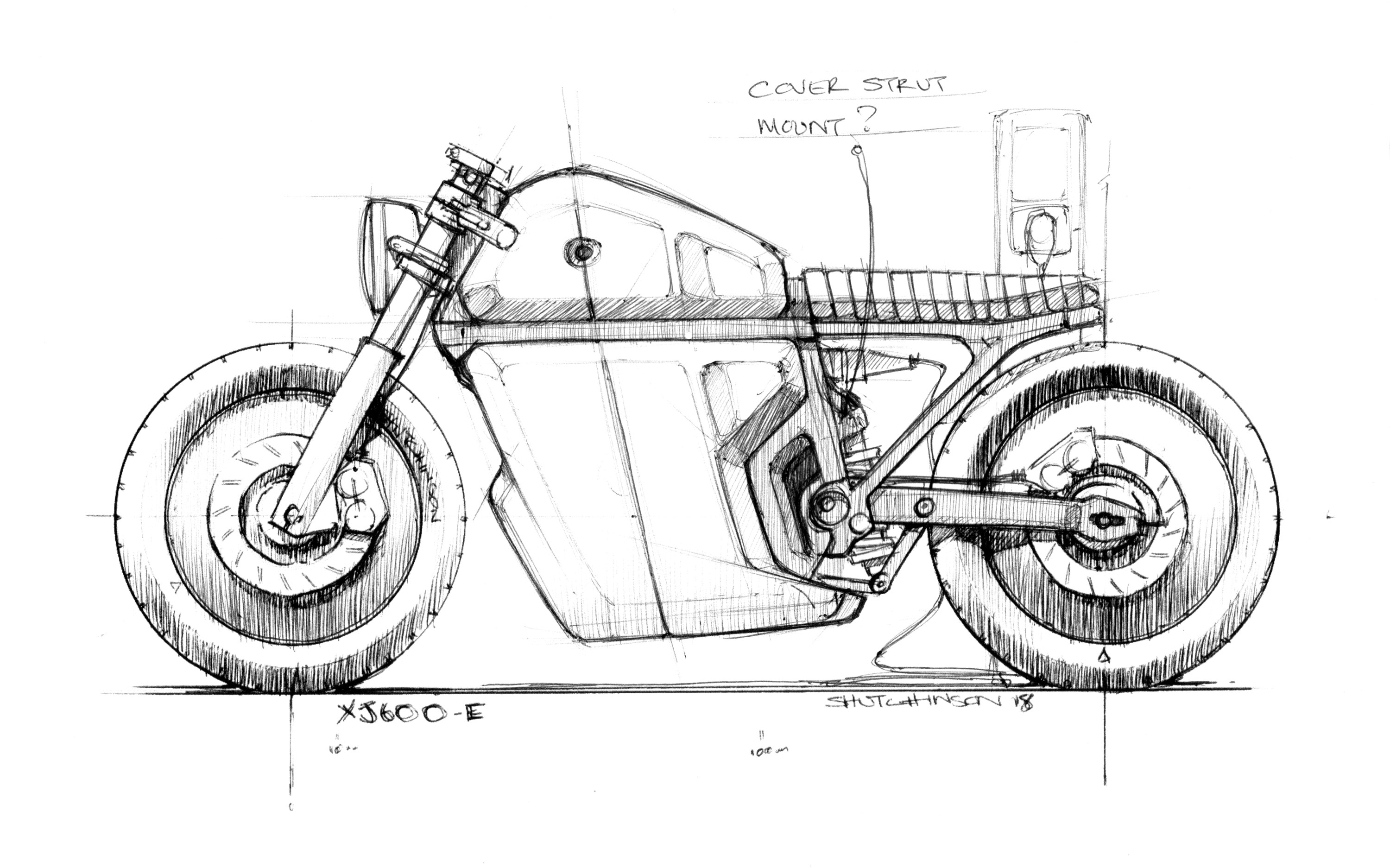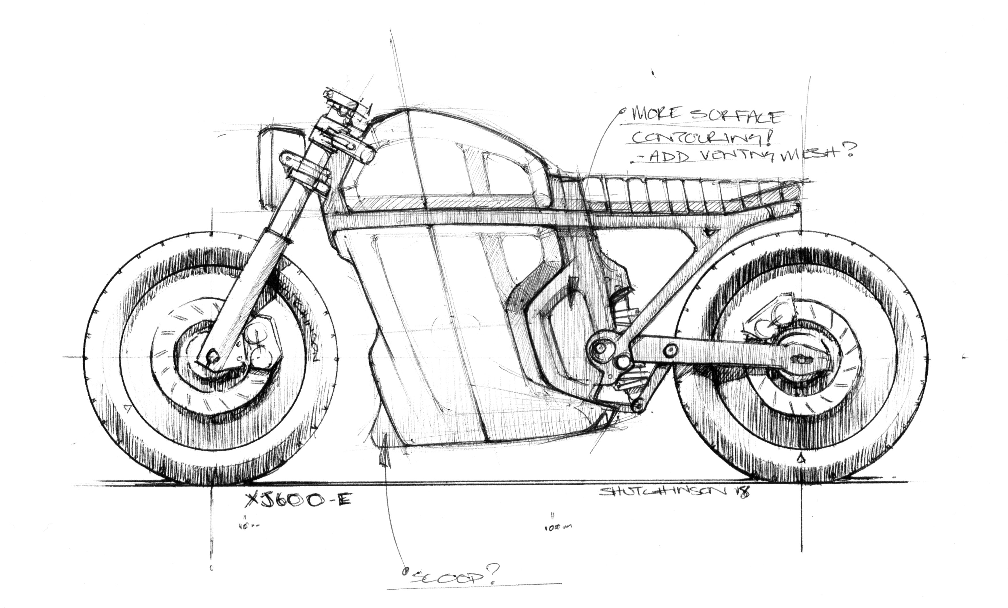 Need to start thinking about surface contours for knees, air outlets for front intake (presuming batteries produce some heat) and to create more interest in places. Just doodling. Need to start sketching in perspective to get a better feeling for the forms. Preferring shorter seat and gap between tank, may continue with these features.