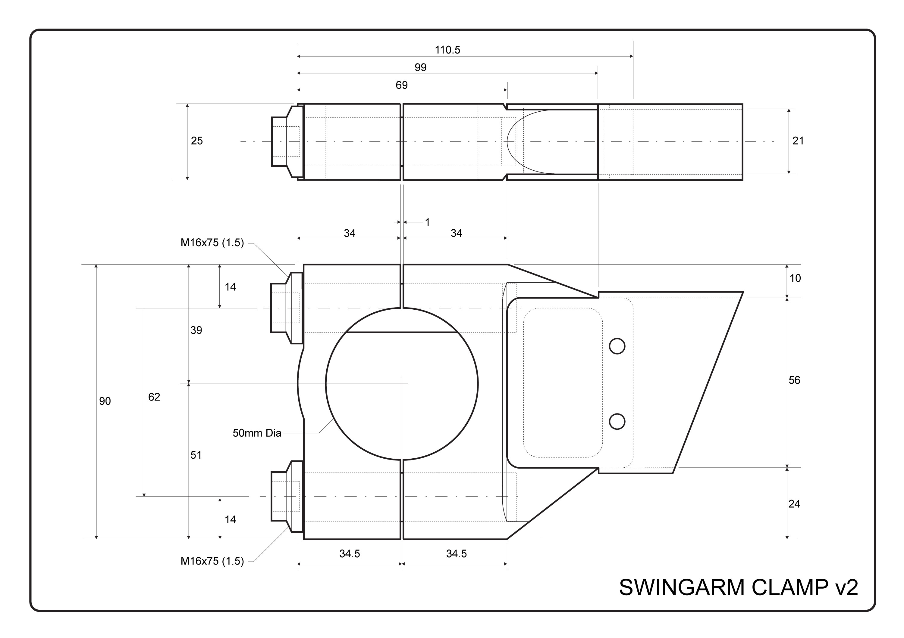The swingarm clamp has been updated to reflect creative changes made in 3D CAD. Additionally the lug that fits inside the 2mm walled 25 x 60mm box tube is lengthened to make a more positive joint and some extra weld holed on the box tube have been added.