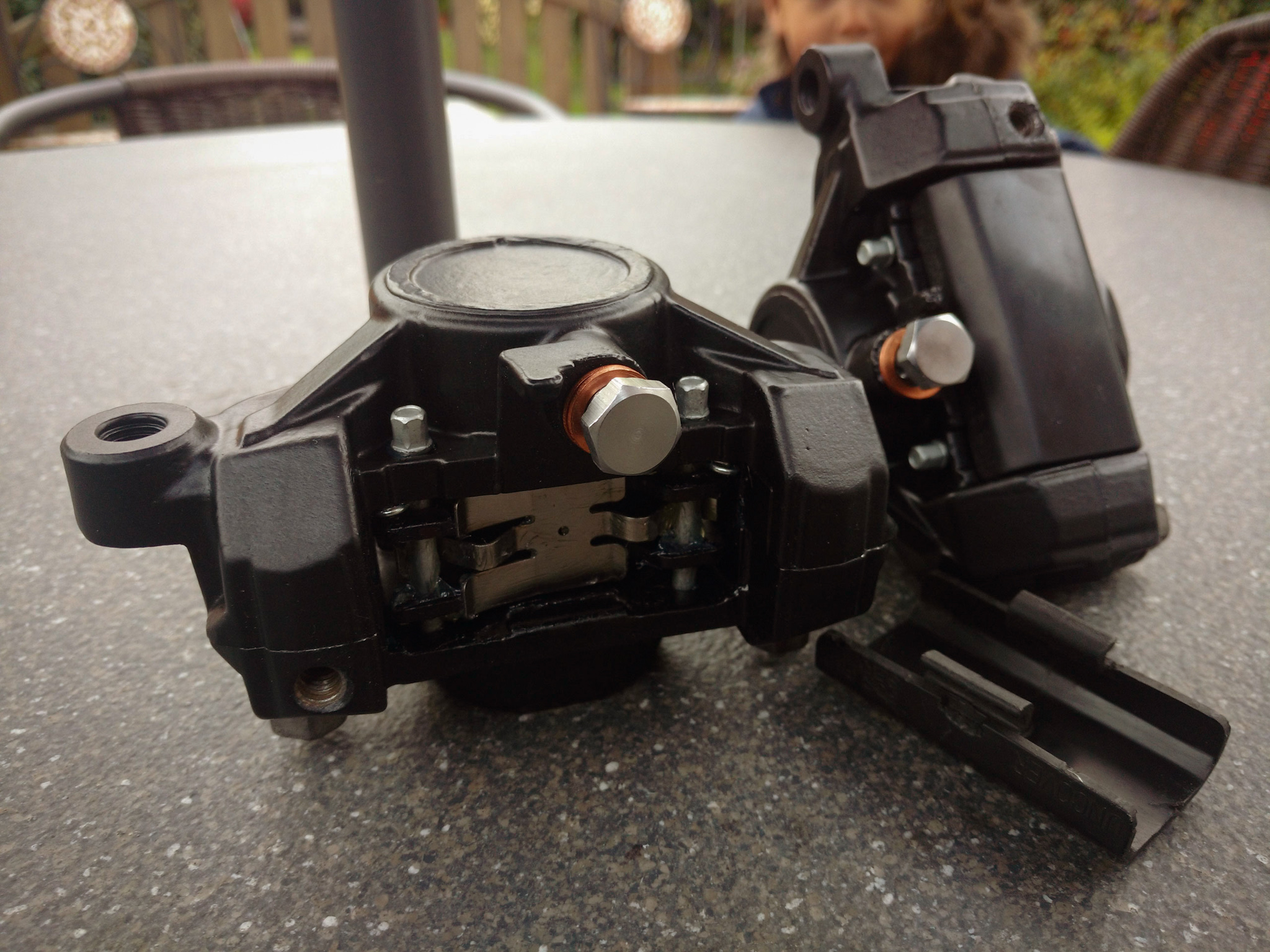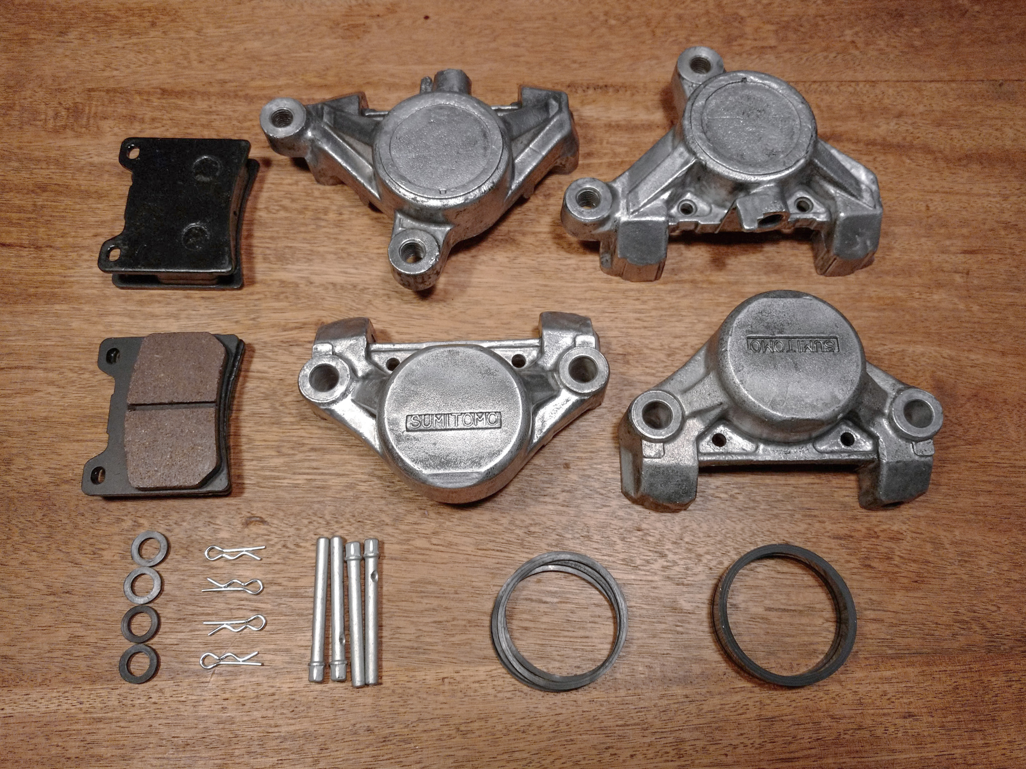 The calipers that came with the forks needed some TLC to ensure the bike has some stopping power. The pistons were corroded into the calipers. A bit of heat released them easily. The pistons, bolts, and aluminium calipers were reusable. A chemical strip, clean, and polish were all that they needed. However the seals, pads, and pins, were renewed. Some etch priming and chip resistant paint and the job is near enough done. Just some bleed nipples and they are ready to mount on the forks once I’ve replaced the oil and dust seals and painted them.