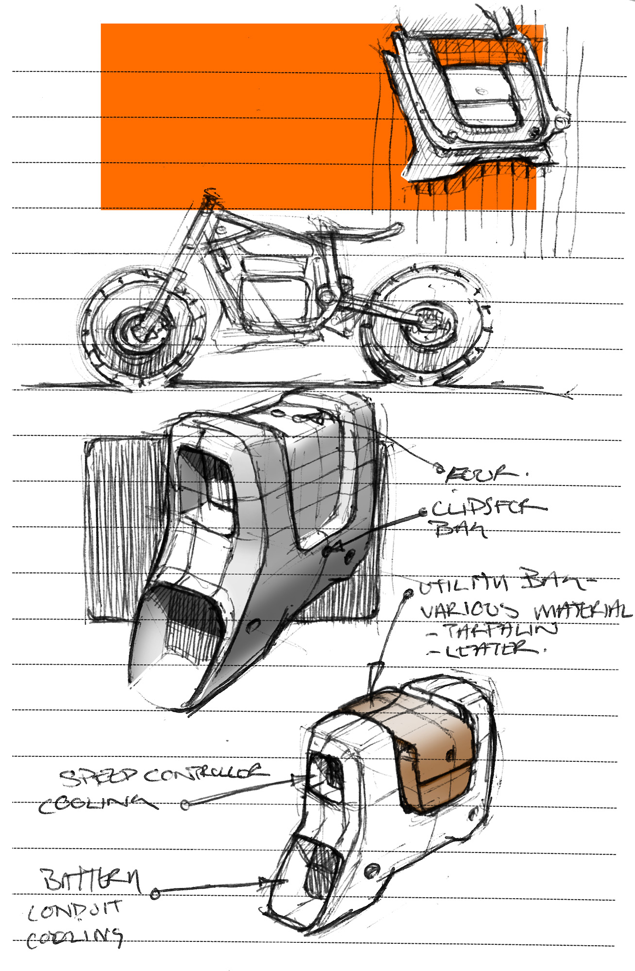 Been thinking about options for storage for some reasons. If I can make the offset surface on the battery case a bit deeper then I could nest a saddle bag into the design to break-up the surfaces and add interest to the area. Could be an interesting feature. Maybe made from reused leather or weather proof material such as tarpaulin.