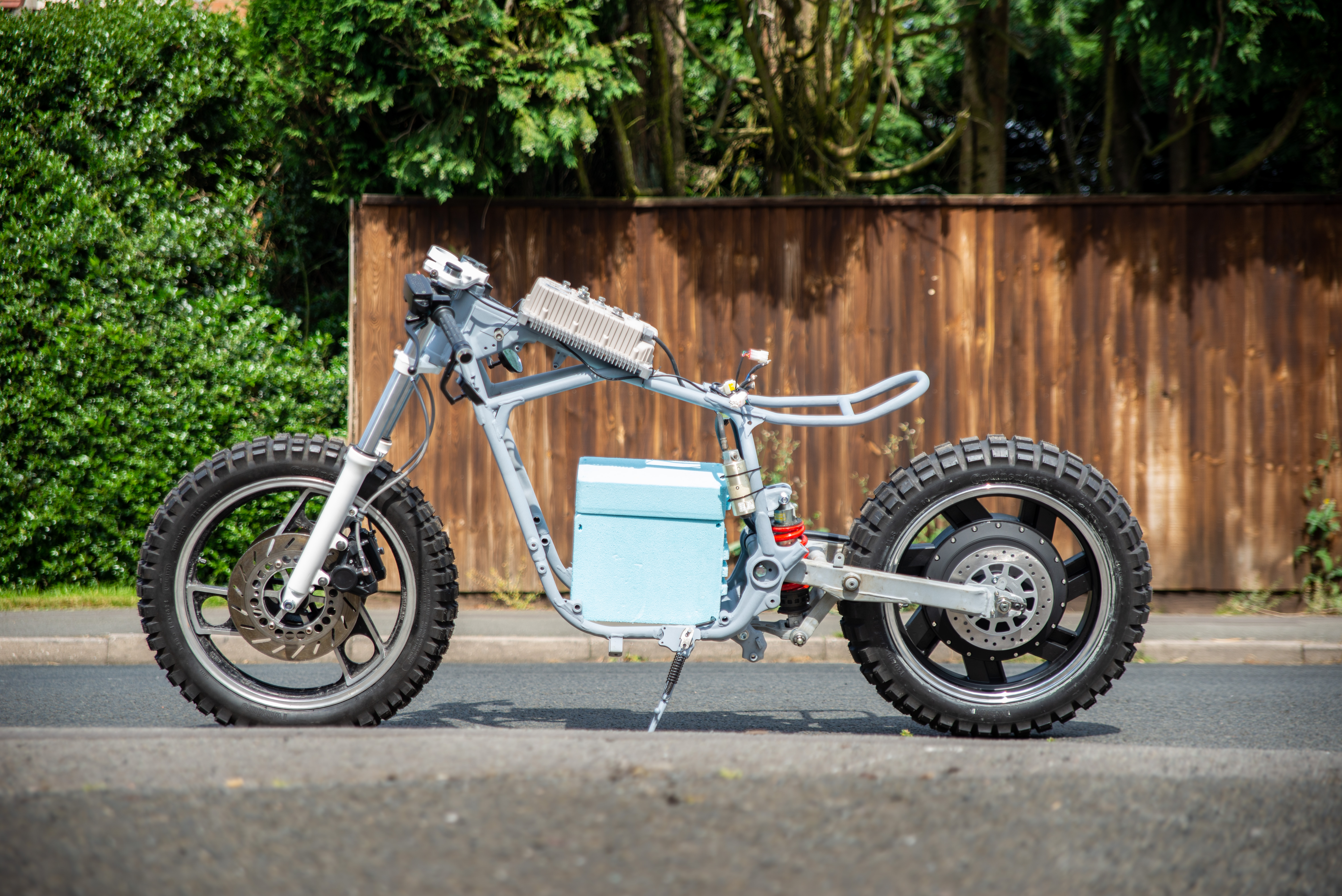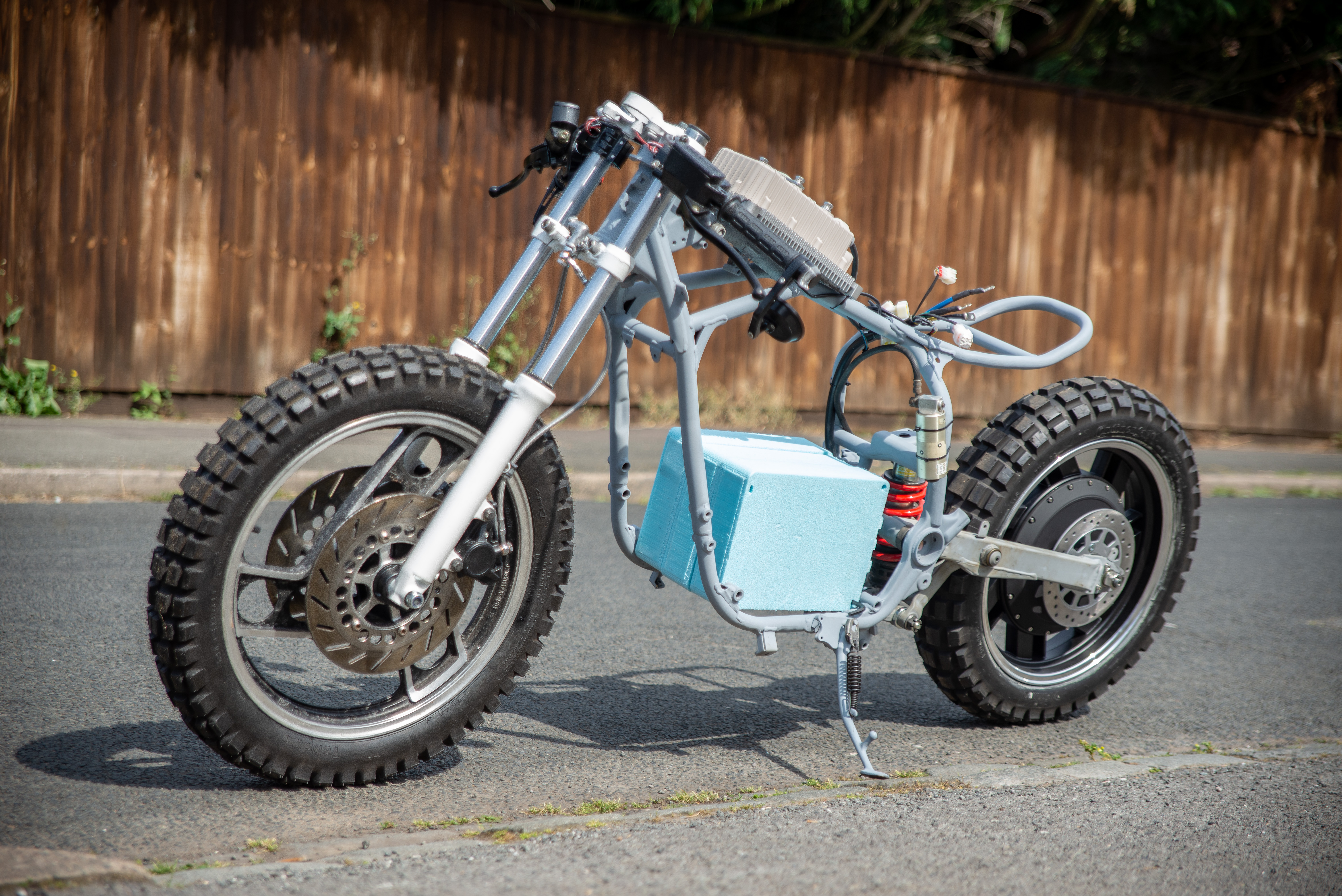 The old XJ600e is standing on its own two feet for the first time ever as an electric bike. In fact for the first time ever as it has spent most of its life propped up on a jack. All the parts fit surprisingly well together. Thinking that I will push the stanchions up ab bit more to reduce the rake and give a more dynamic stance when the straight cafe race bone line is established in the bodywork.