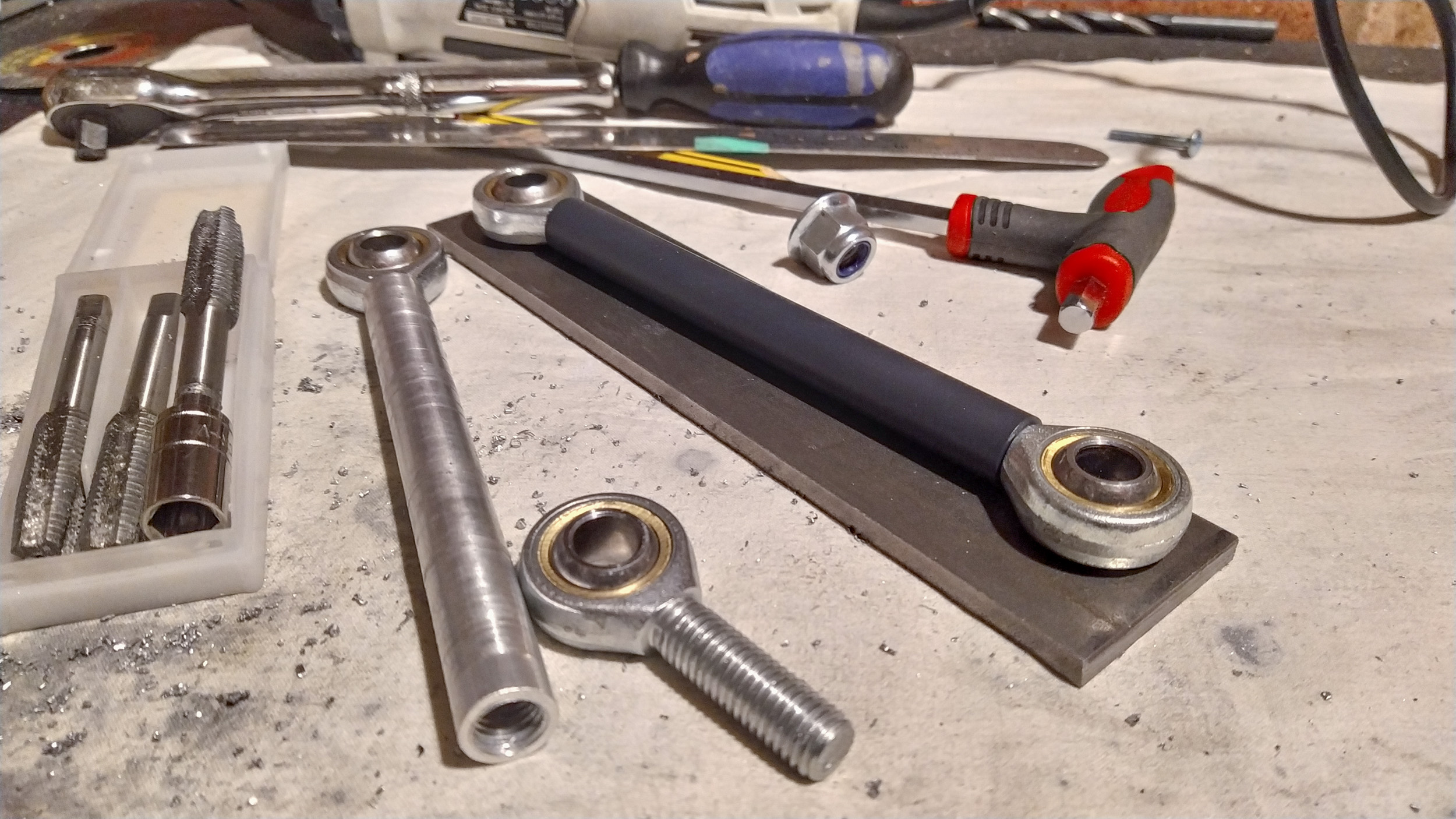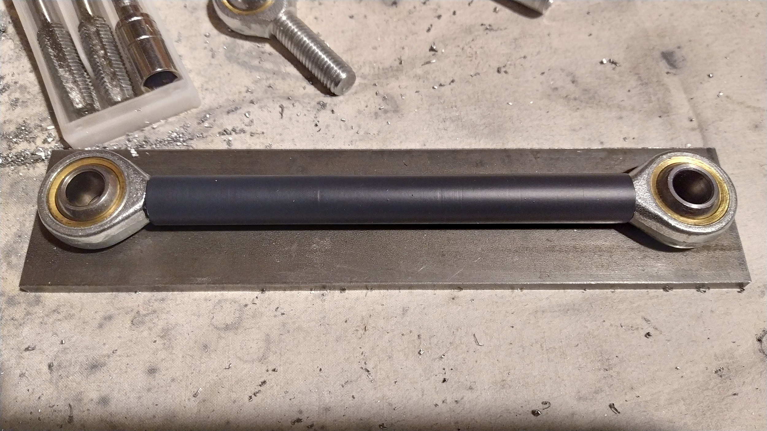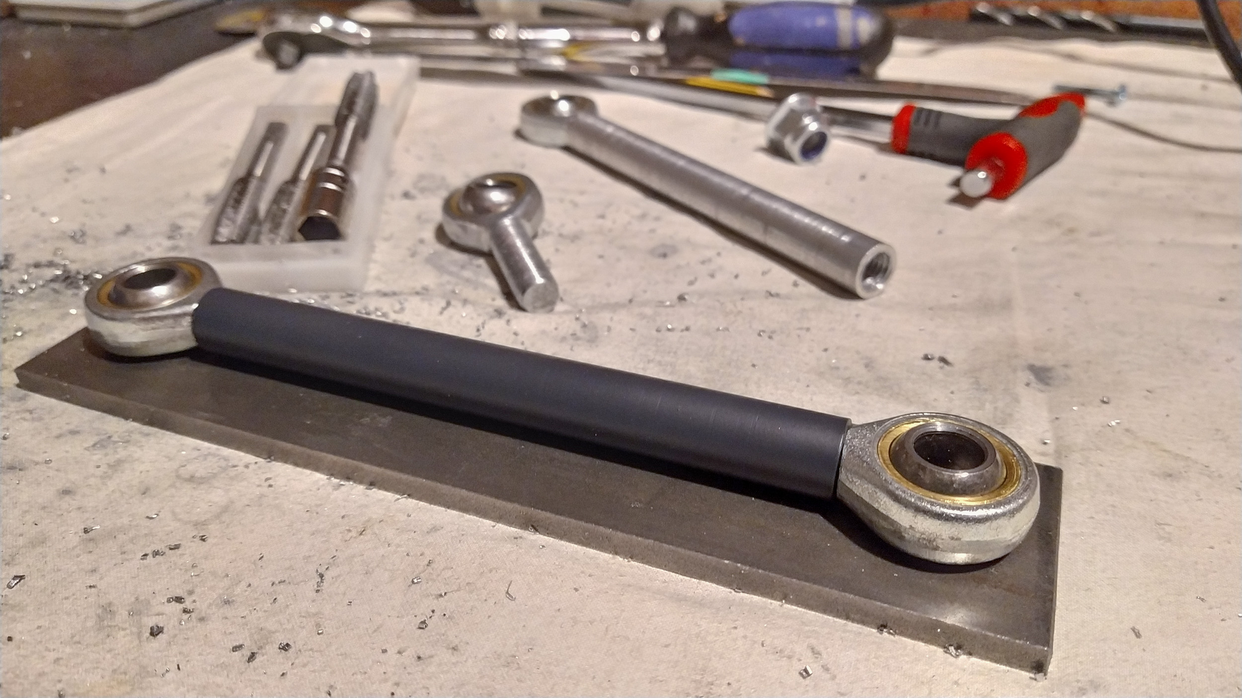 I have made some strides towards sorting out the seat supports for the bike as discussed in a previous post. Managed to get some aluminium tube, thread taps and rose joints. Need to get a longer 110mm / m12 / 1.75mm thread / 12.9 grade bolt for the mono shock and make some lugs to weld onto the frame… work in progress!