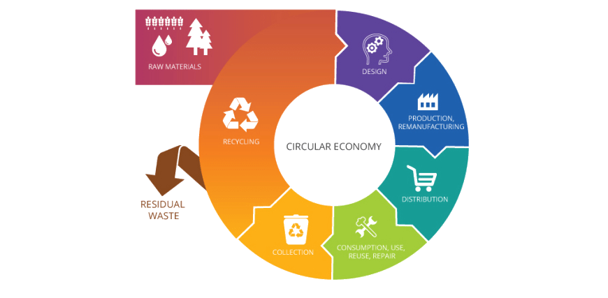 Design is a critical part of The circular economy. Energy storage companies describe design as the ‘first real step in the circular economy’ (Energy, 2019). Raw Materials, Design Process, Production, Distribution, Consumption, Collection, Recycling, and Residual Waste are all critical factors in the circular economy . A typical model for the circular economy is illustrated in the diagram below.