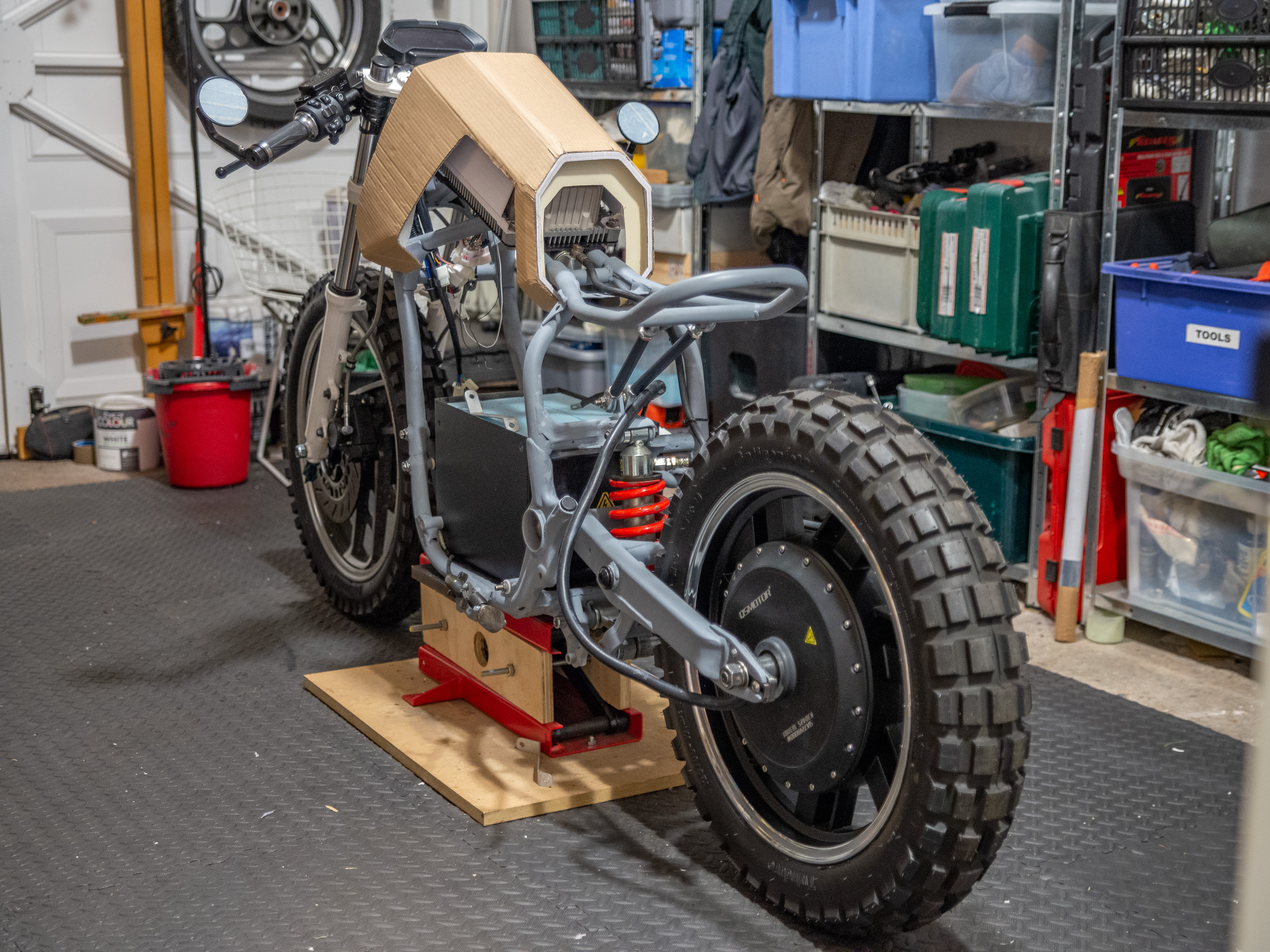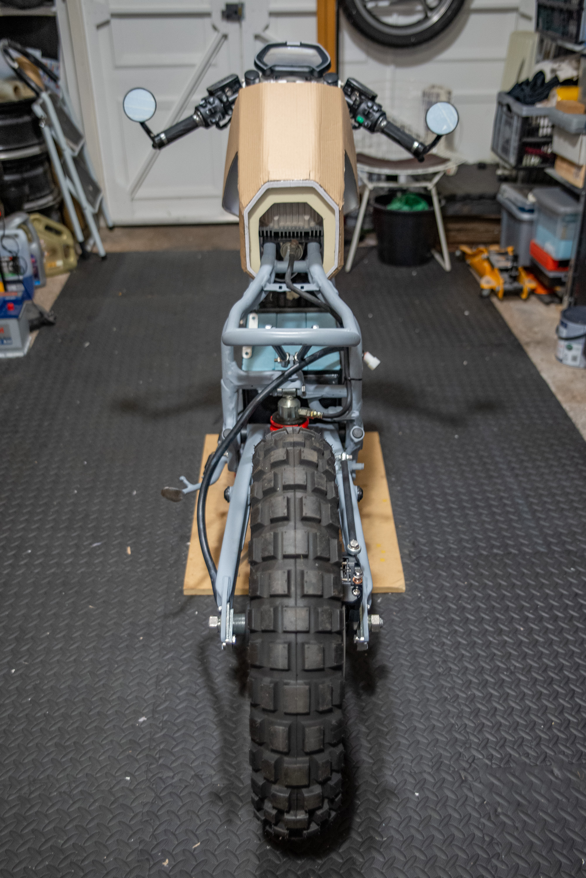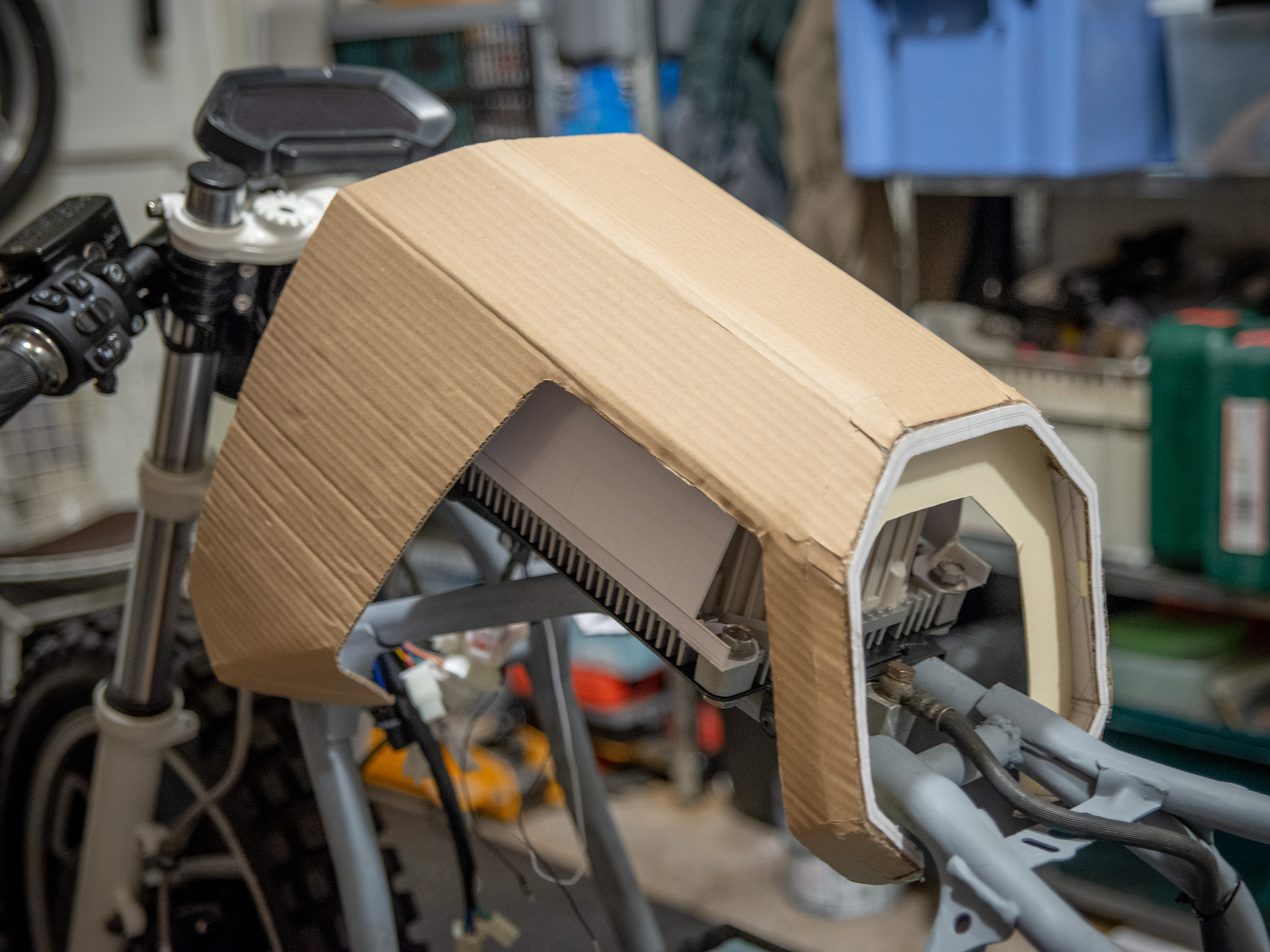 Finally managed to get the bike all into one place back in the garage after being locked out of the NTDC due to COIVID19. Thought it would be good to check some things that can be seen in 3D models but still leave a bit of doubt with regards to the real thing. After a it of surface unfolding and printing to transfer the model to card. the realisation of the virtual design was easy. First concern was component clearance, was close but all is good so far. Overall width of the top panels was also a doubt; I wondered if it was too narrow, in real life it was slightly wider than I thought — The photos narrow the perspective a but but it is close.