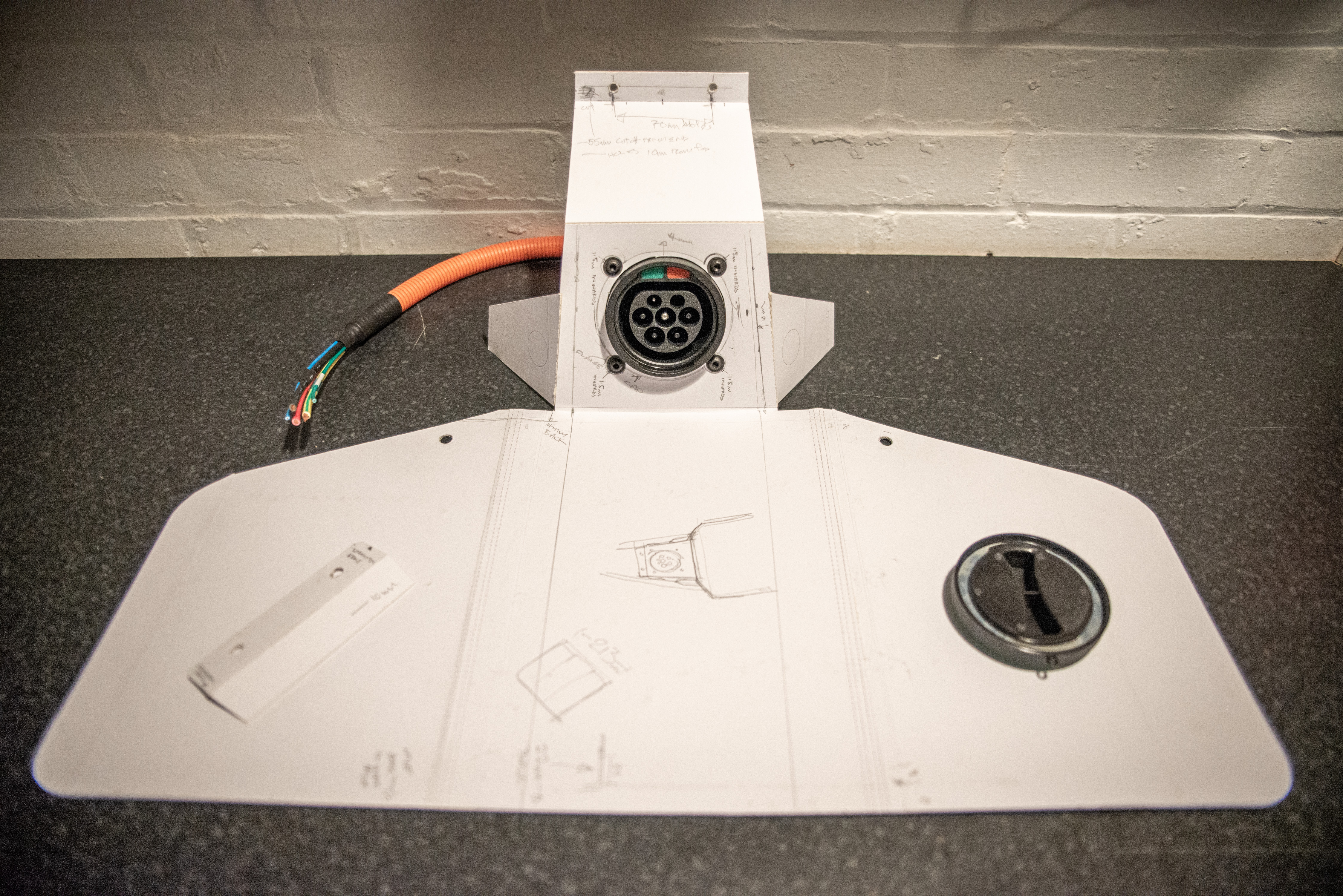 Started to mock-up the sub-frame for the charge point and battery cover. Still enjoying the physical CAD feeling. First stab works but feel that this is an ideal opportunity to make changes to the 3D surface formation that were mentioned in a previous post. Previous fixing points seem less physically stable than originally proposed so am switching to a new proposal of making some notched spacers with threads that I will eventually weld to the frame to ensure secure fixing of the charge point frame.
