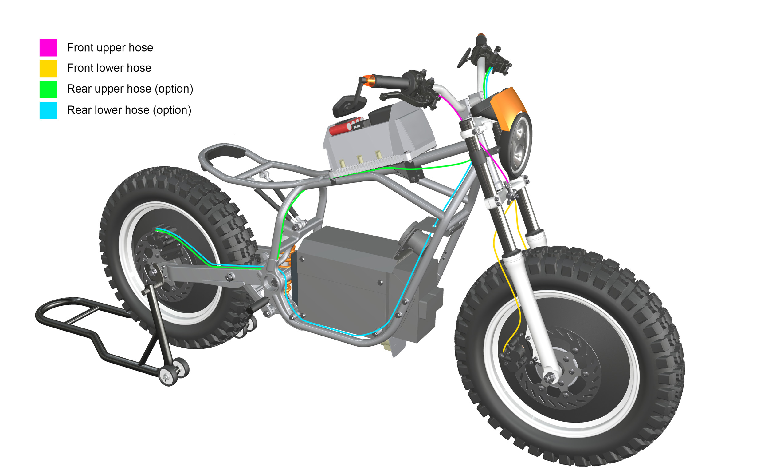 Planning the final dimensions for the brake lines. Measurements have been taken with a cord. The factory lines at the front (1 x 310mm upper / 2 x 495mm lower) do not need to be changed. However the rear line is a new dimension because the foot brake has been removed and the left handlebar lever is now a brake lever like a bicycle because the clutch is no longer needed — makes life simple.
