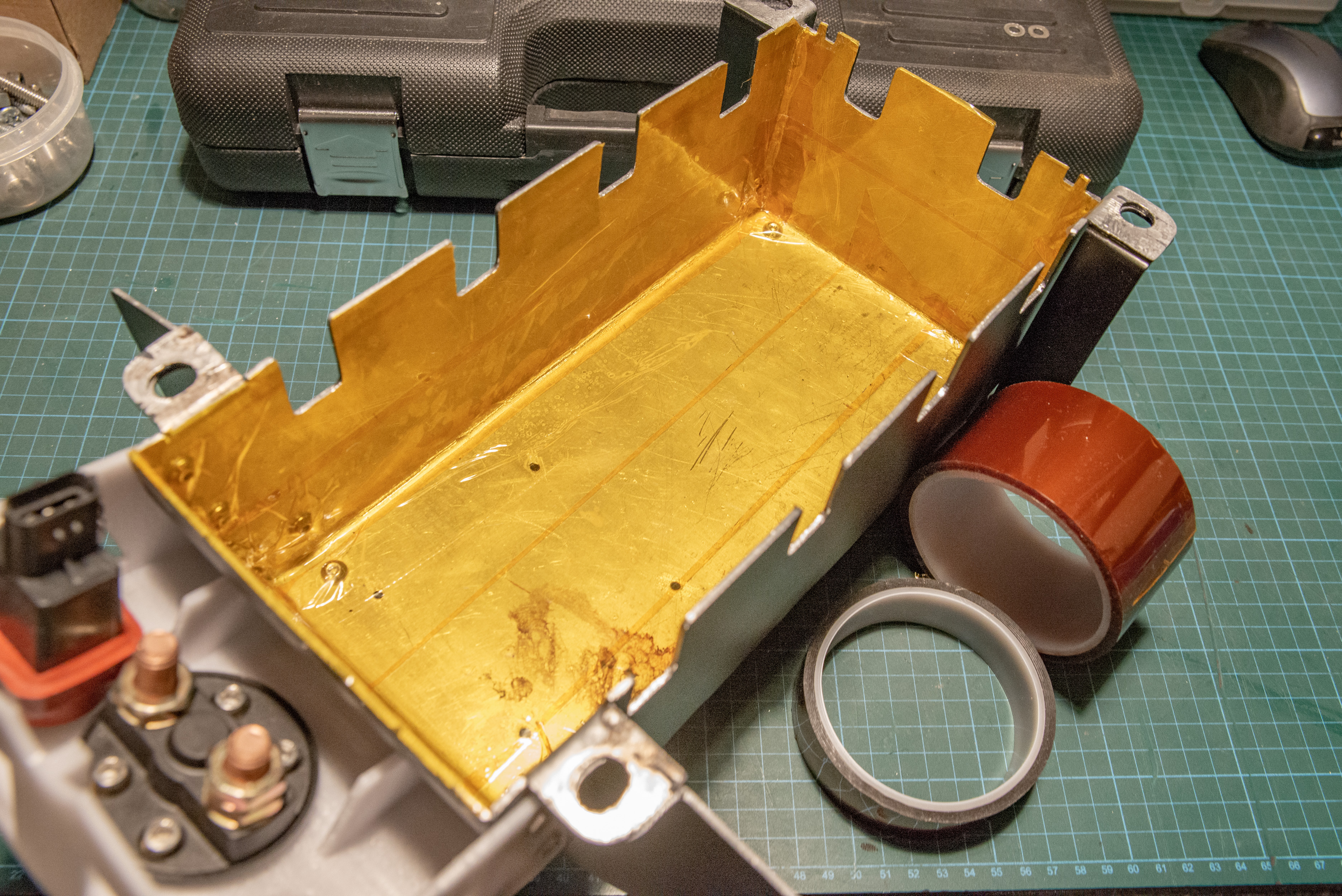Feeling paranoid that I am placing batteries in metal cases I have decided to insulate the inside of all the metal boxes. Even though the voltage cable connection points are covered with rubber boots and no metal is exposed the inside of the controller (pictured) has been coated with heat resistant high temperature polyimide tape to avoid any hard shorts. The inside of the battery box has also been lined with 1mm thick heat resistant PTFE sheet, corner sealed with polymide tape. Basically if there are any circuit issues it won’t be because of the metal cases.