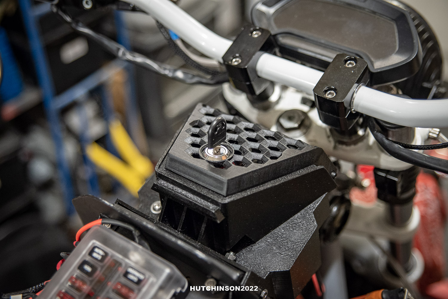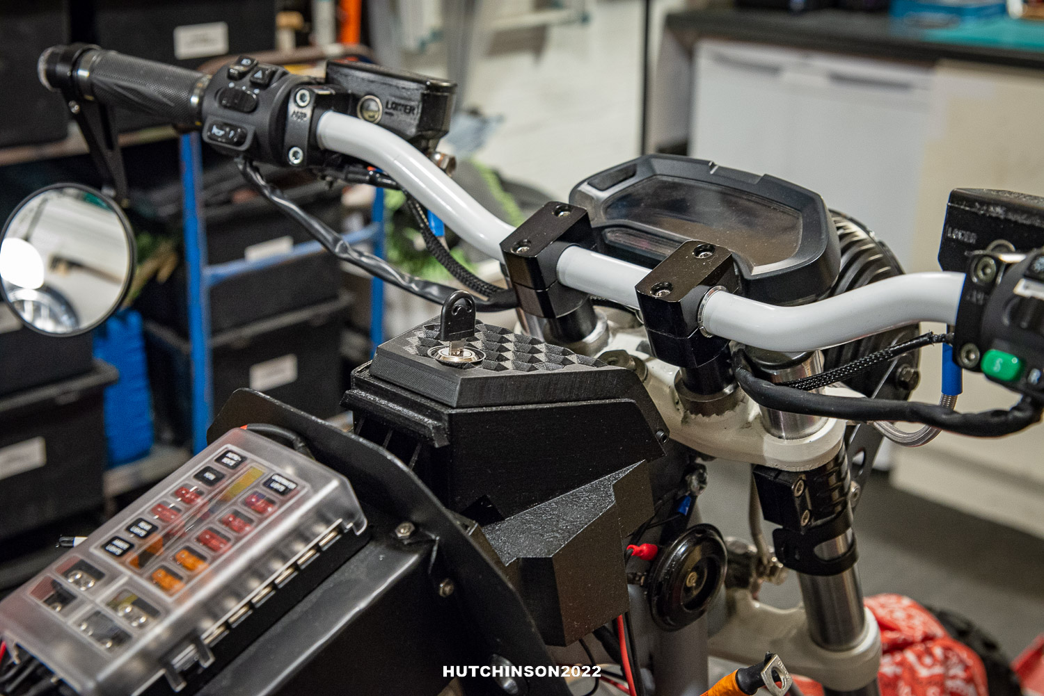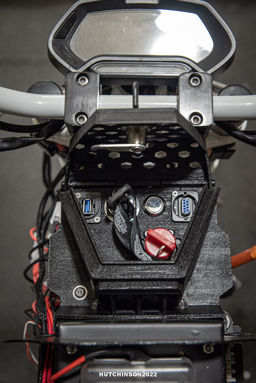 I have installed the v2 control panel that will accommodate the covering covers for the bike and now holds the contactor. Happy with the fit. I was slightly worried if the flap-up cover would collide with the handle bars, but all was good. Reach is good and all the switches can be activated from the seating position. Just need to replace the bolts with fancy looking black dome hex heads, add a fixing rod through the middle of the hinge and place the backing material against the back of the flap-up cover.