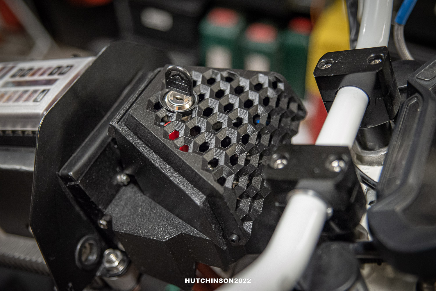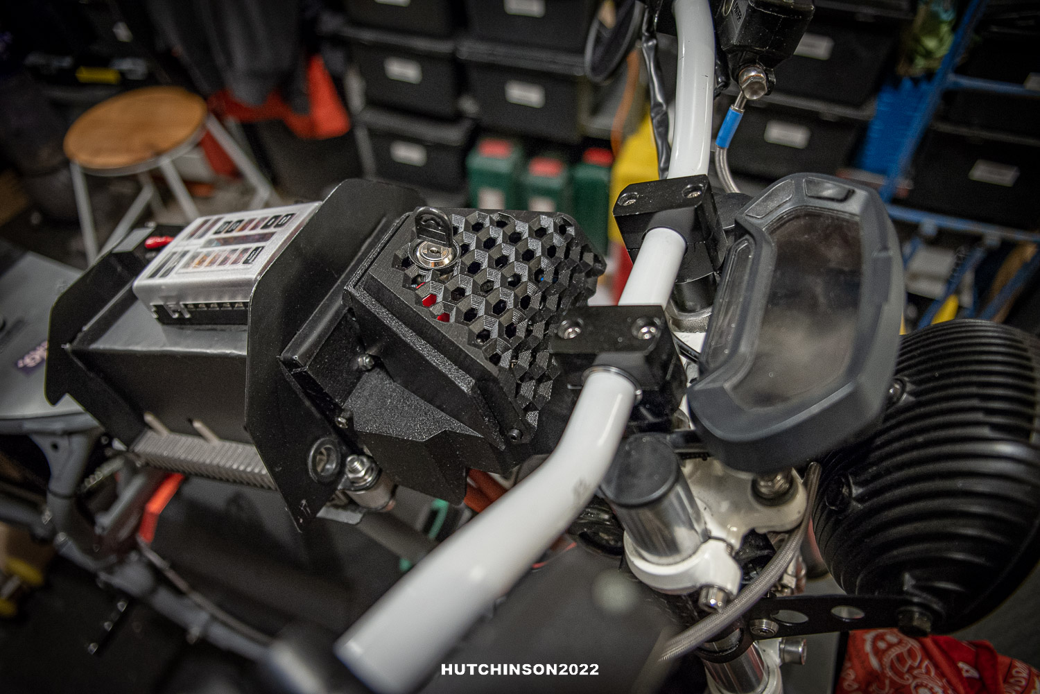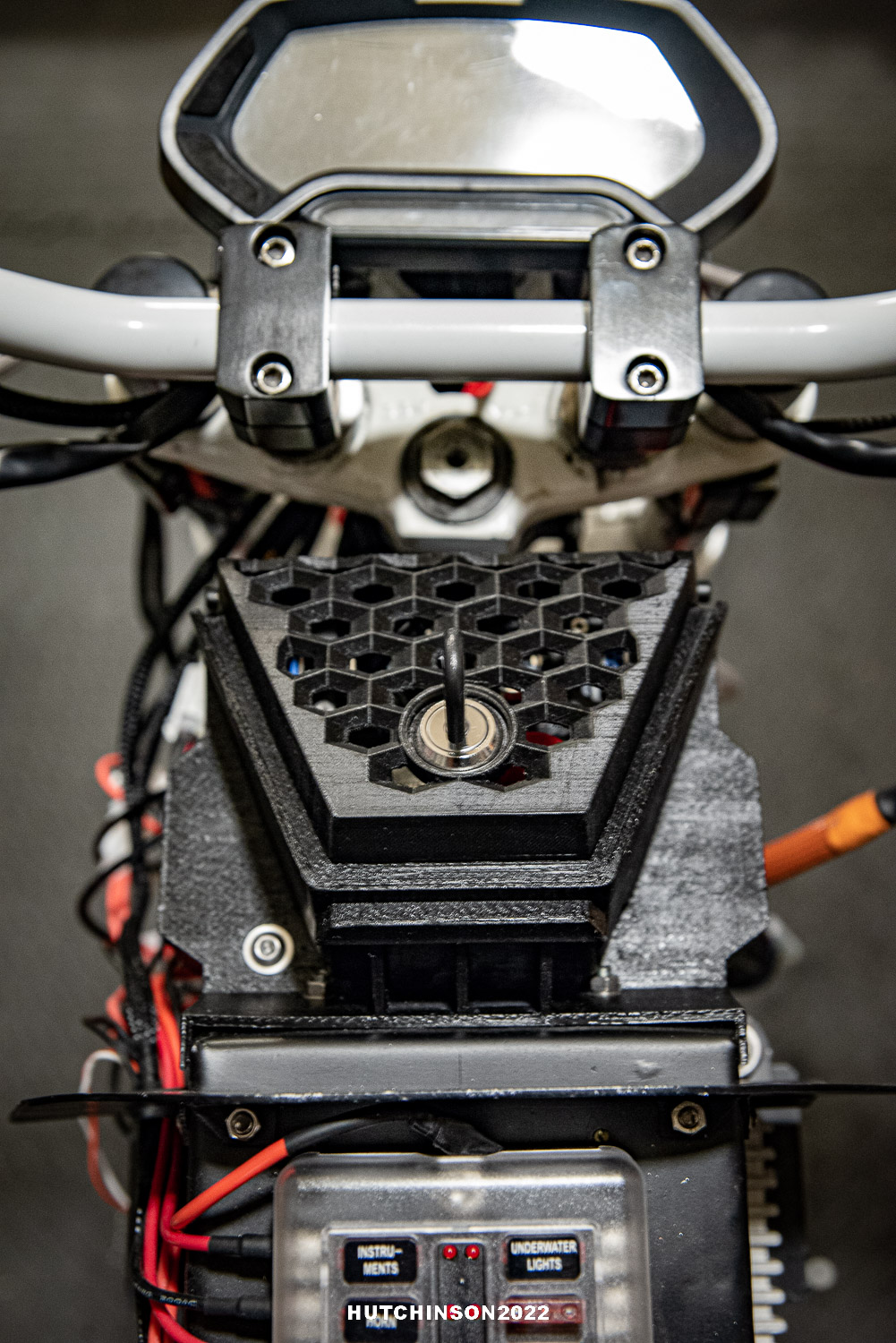 I have installed the v2 control panel that will accommodate the covering covers for the bike and now holds the contactor. Happy with the fit. I was slightly worried if the flap-up cover would collide with the handle bars, but all was good. Reach is good and all the switches can be activated from the seating position. Just need to replace the bolts with fancy looking black dome hex heads, add a fixing rod through the middle of the hinge and place the backing material against the back of the flap-up cover.