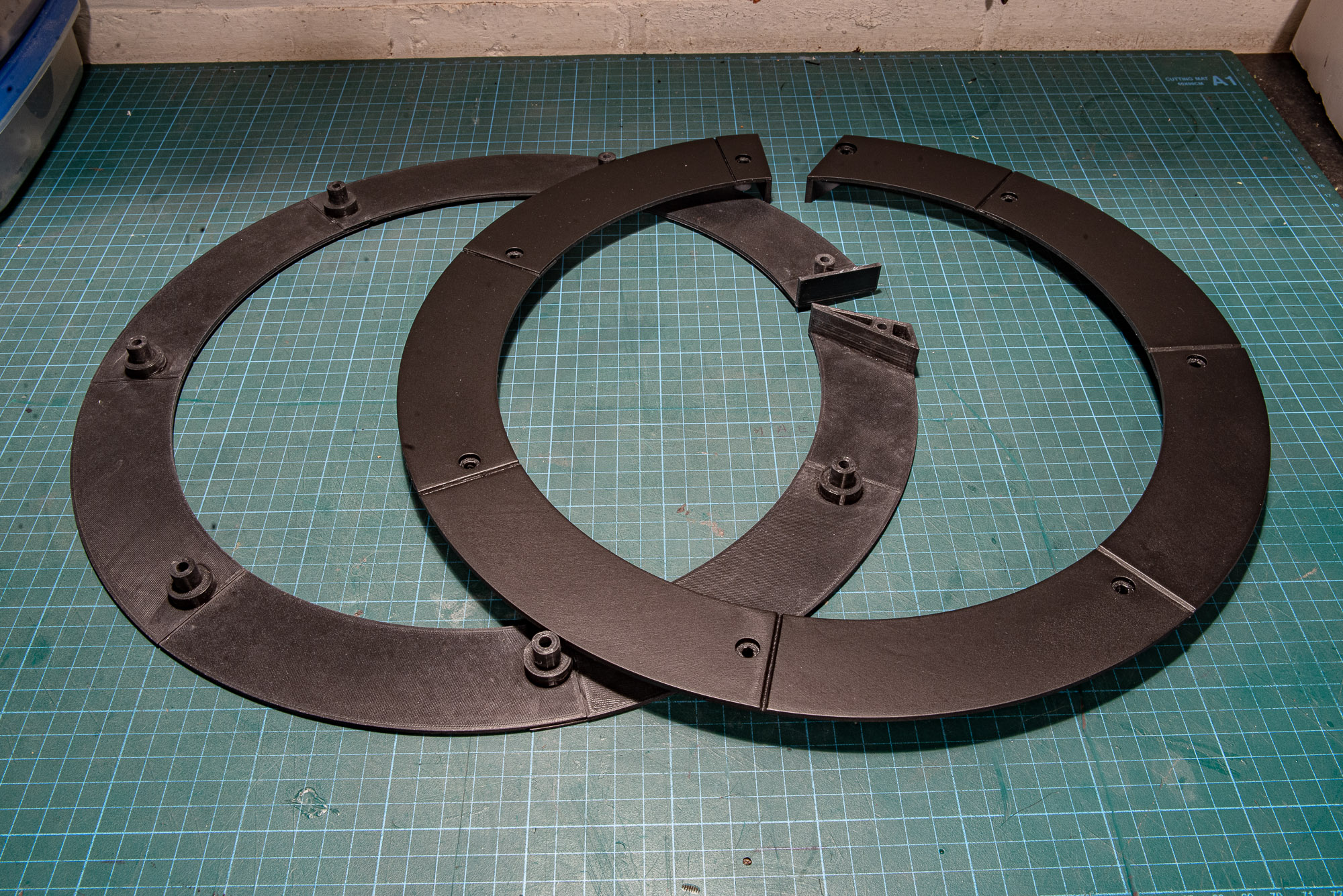 Have spend a bit of time practicing the split part thing on the wheel covers. The first version is flat but I’ll aim to angle the surfaces on future designs so that they match the angle of the bevel on the hub motor. On the QS hub motor 35mm M4 screws are perfect to attach them to the spokes. These have been tacked together with glue to keep them in place during the prep and positioning but think they could be installed without.