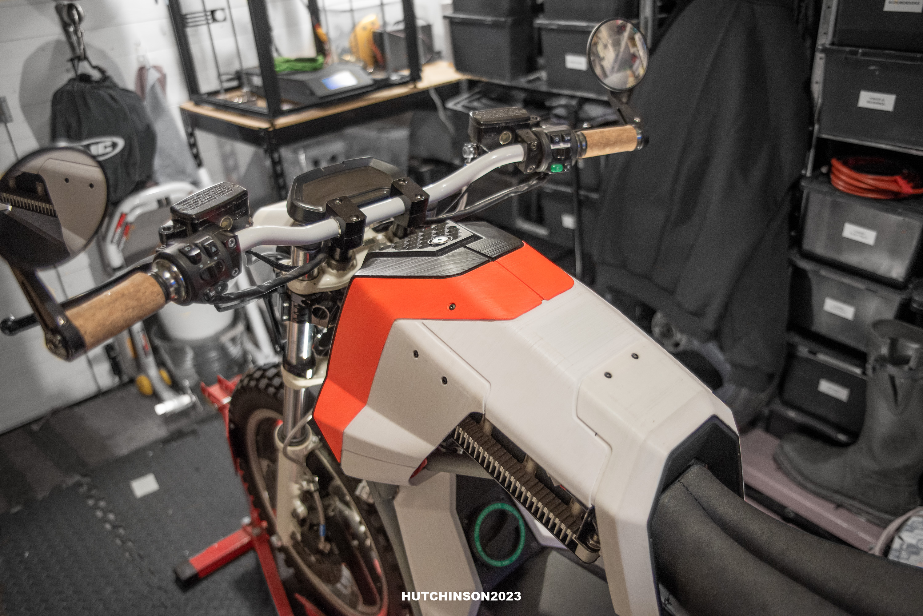 Watched the Creator over the weekend. Was inspired by the colour ways of the AI robots. I mocked up a section of the bike with florescent paint. similar to the one used in the cable collar. Think I will get some orange tape to try different graphics on different parts of the bike to see what else would work in terms of colouring section like the robots.