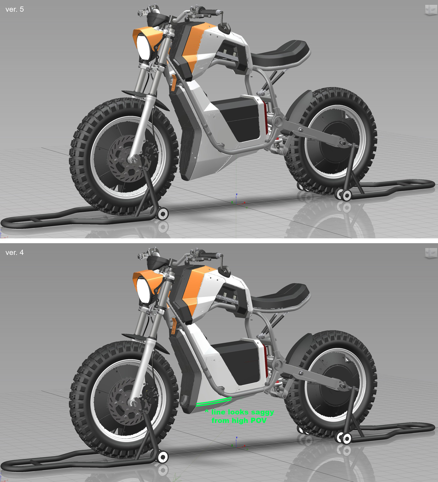 From a real eye point of view, when you stood next to the bike*, a lot of the surfacing at the base of the battery box casing were not visible. This drew attention to lines that misdirect the eye and make the case look saggy at the bottom instead of making the bike well stanced, aggressive and edgy. The more I looked at it, the more I found the surfaces and the line visually offensive. I hated it. So, as a solution I thought I’d try to drop the battery case surfaces under the frame to see how that works… and of course, new prints to check it out in person.