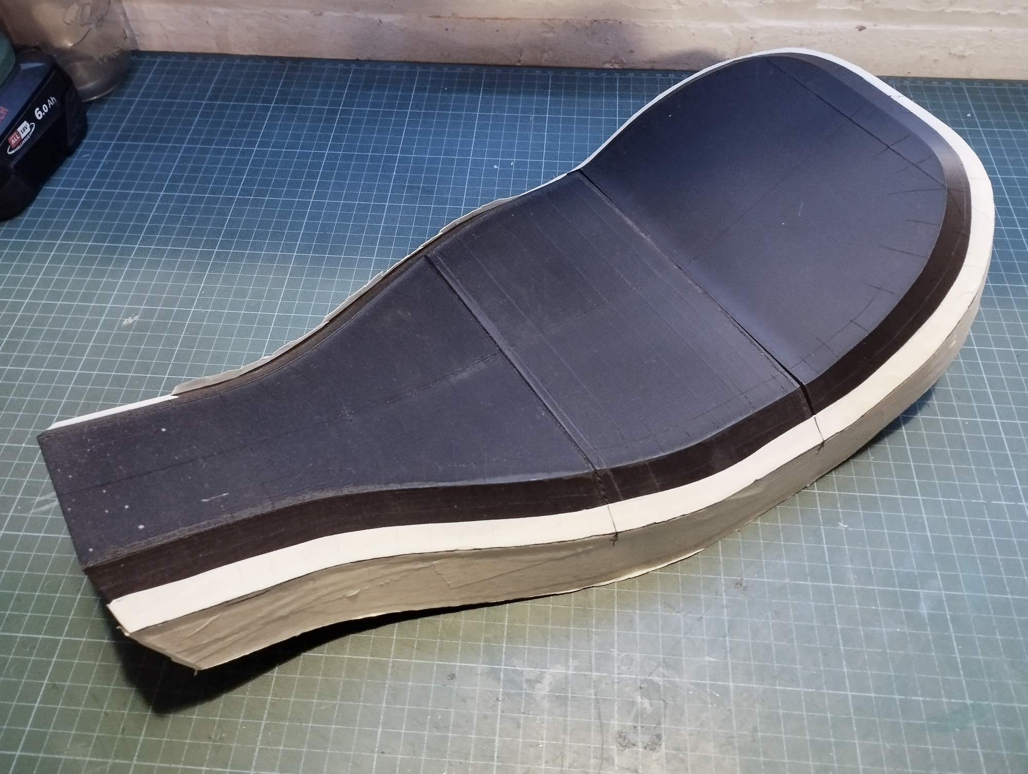 Used two types of foam based on advice, recycled chip foam for the base to help form a hard edge and take my weight, and a softer one on top to provide some comfort. Cutting and adhering the foam was a pain in the arse. But some work with a cheese grater used under advise of a foam supplier, and a very sharp knife helped to shape it.