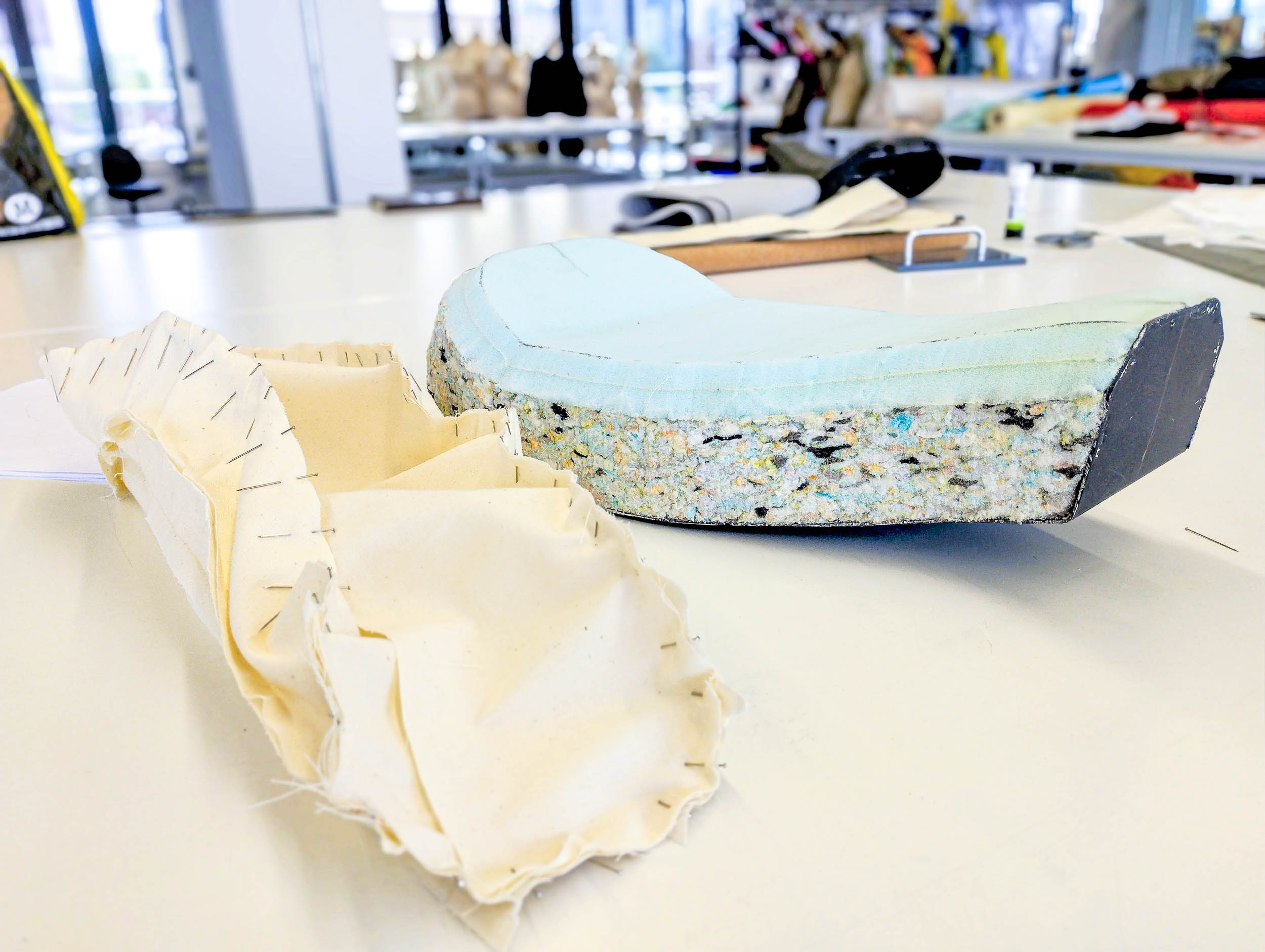 Following more advice from fashion technicians who specialist in pattern making I cut and stitched a toile (pronounced ‘twaal’) to mock up the pattern and ensure it fits. First one suggests that I need to work on the foam a bit more to add volume, but getting there.