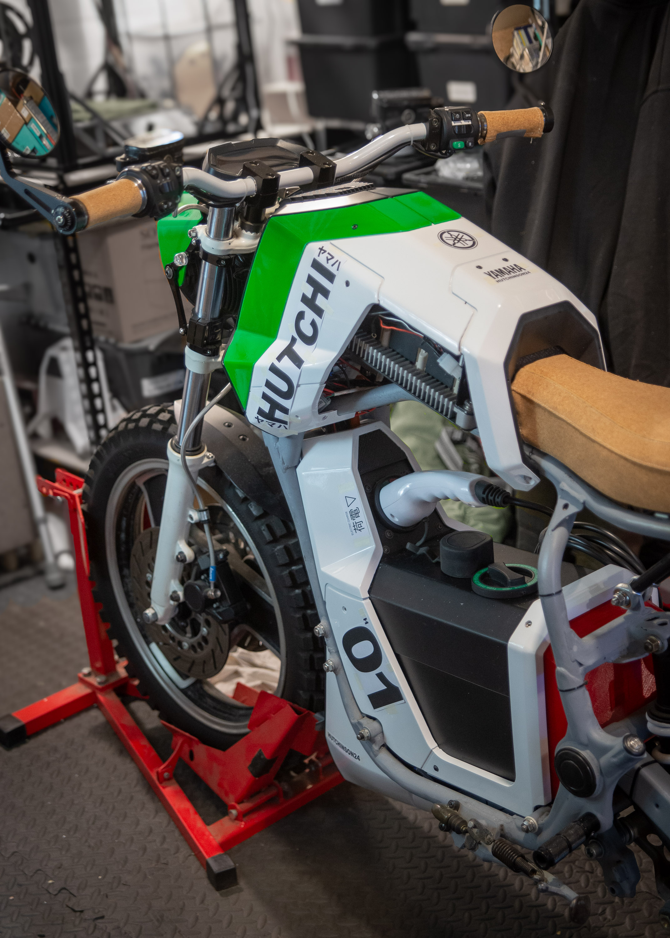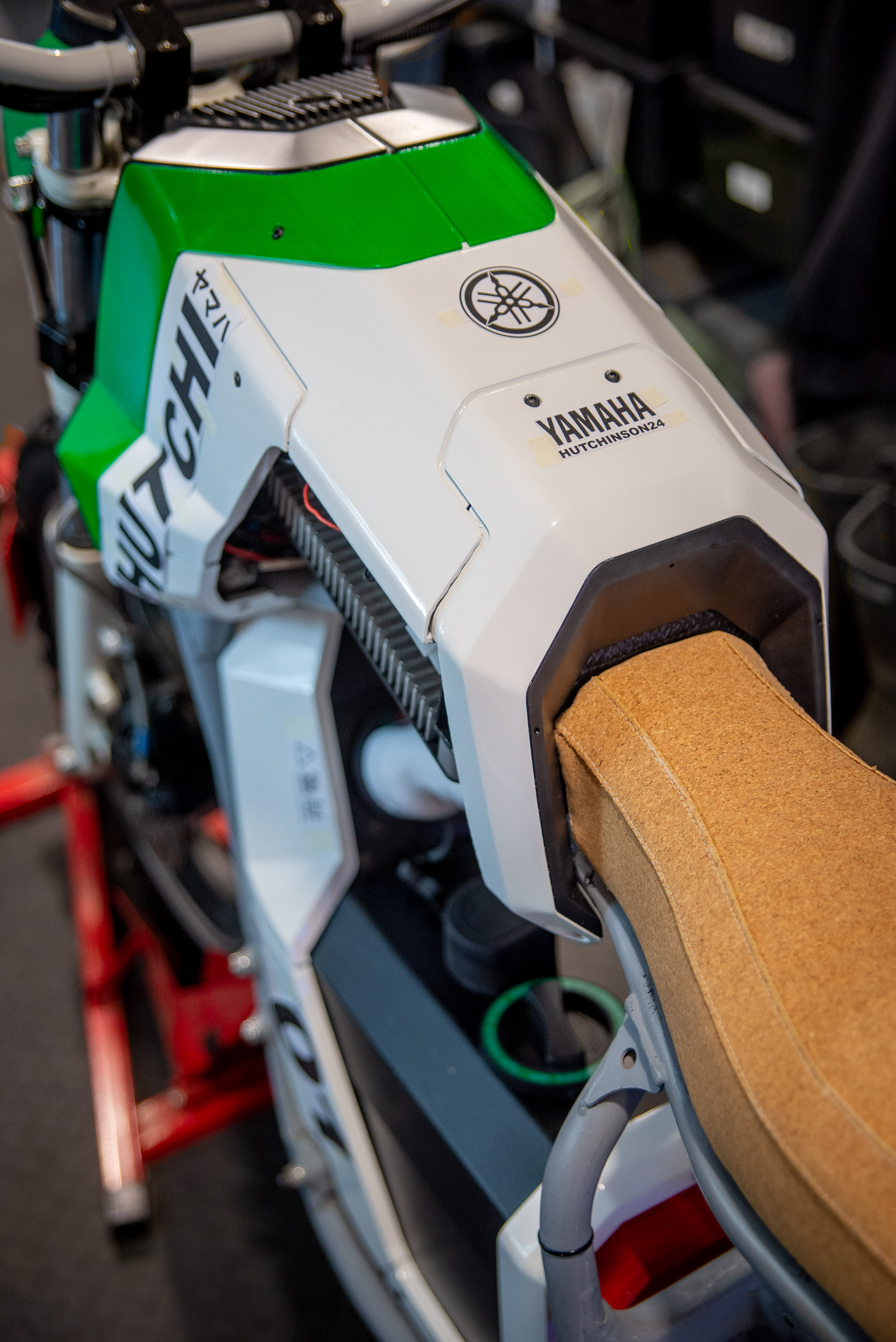 As it was a Japanese bike originally I thought I’d use that as a theme using Japanese translations for unique area such as the charge point, and the main side graphic ‘HUTCHI ヤマハ e’. The ‘e’ referring to it’s new fully electric identity and ‘ヤマハ’ being Yamaha spelt using Japanese characters. Thought I’d keep it simple though because being a non-Japanese speaker I’m just asking for things to go wrong regarding meanings of words. On the main graphic I thought I’d go for a large bold style of lettering, similarly on the prototype h-number to give it a racy look.