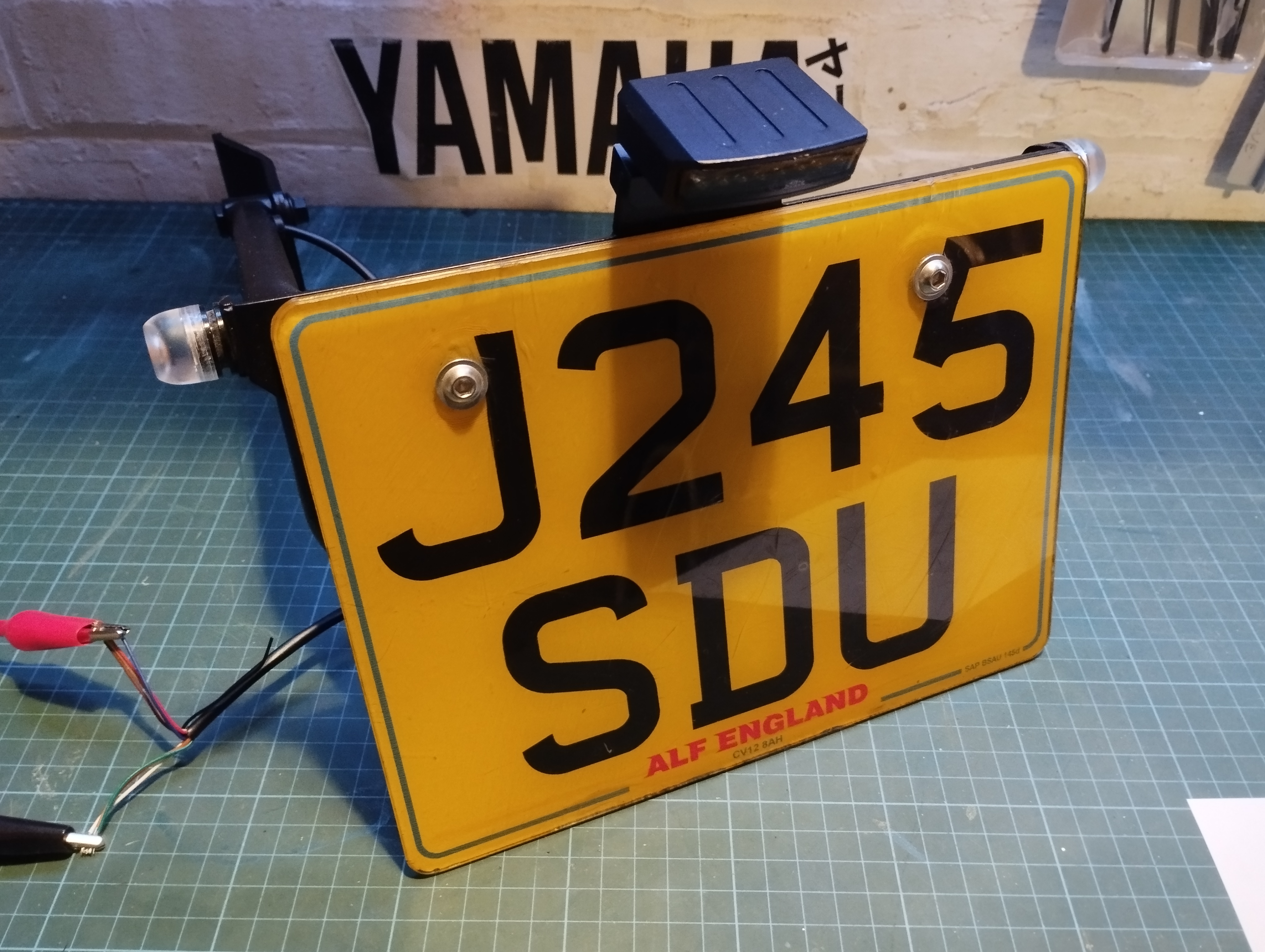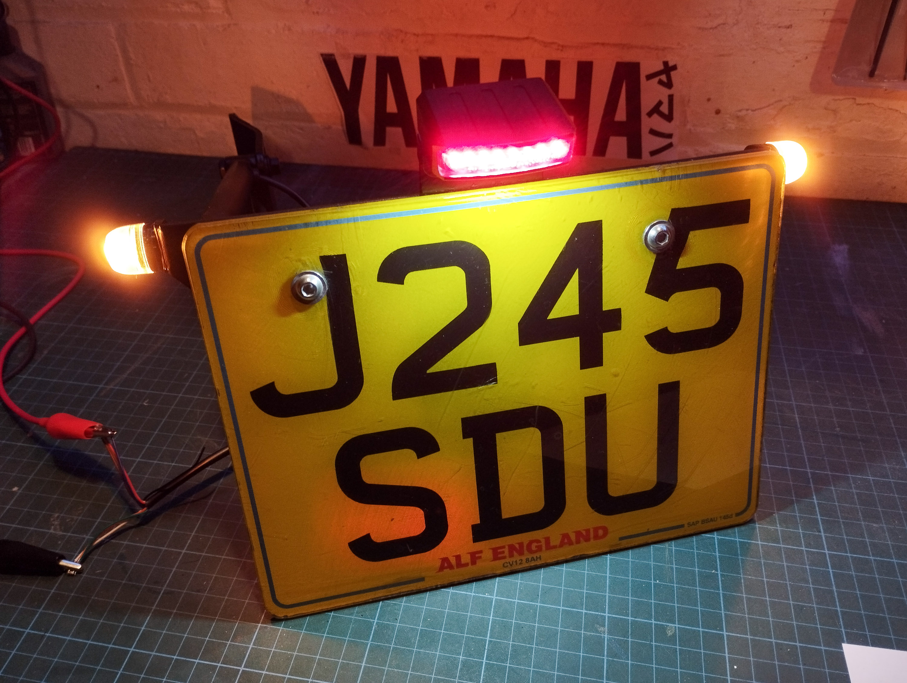 Got the rear light kit up and running. I knocked up a 3mm aluminium number plate holder to attach to a KTM number plate bracket to hold the lights a while back. However, up to now the biggest issue was lighting the number plate as well as a running/brake light in a small package. There are plenty of big lights kits available but these looked terrible. After a good search I finally found one made by Shin Yo here. The light is E-Rated so that is perfect.