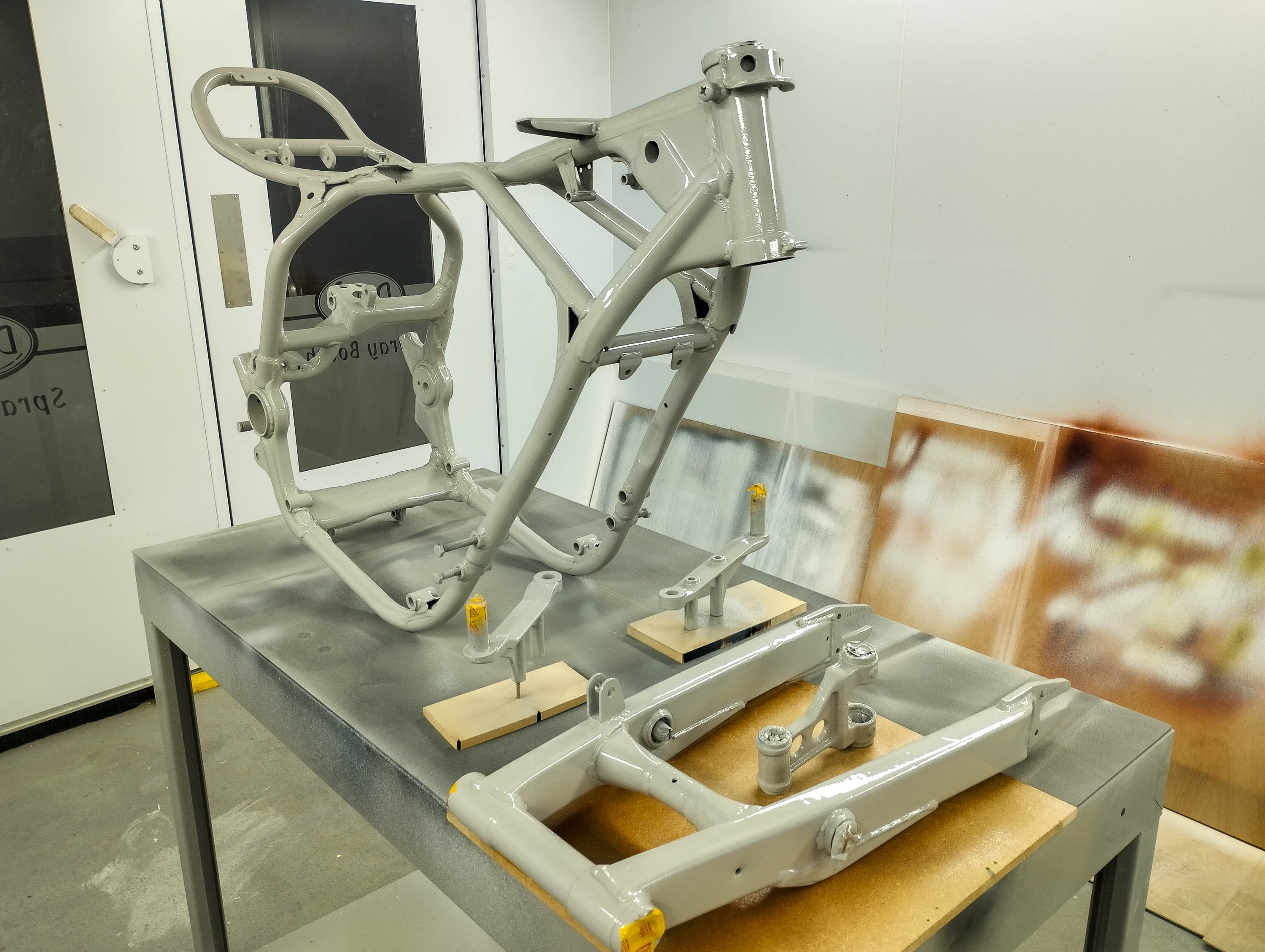 My practice working with 2K paint and advice from my uncle has paid off. I managed to paint on the frame. I colour matched the frame with the helmet… The colour seems to be really sensitive to light and texture. The colour is closer to a cooler light grey in outdoor light, however matt and gloss look like different colours. Thinking about clear-coating the helmet now to get a closer match.