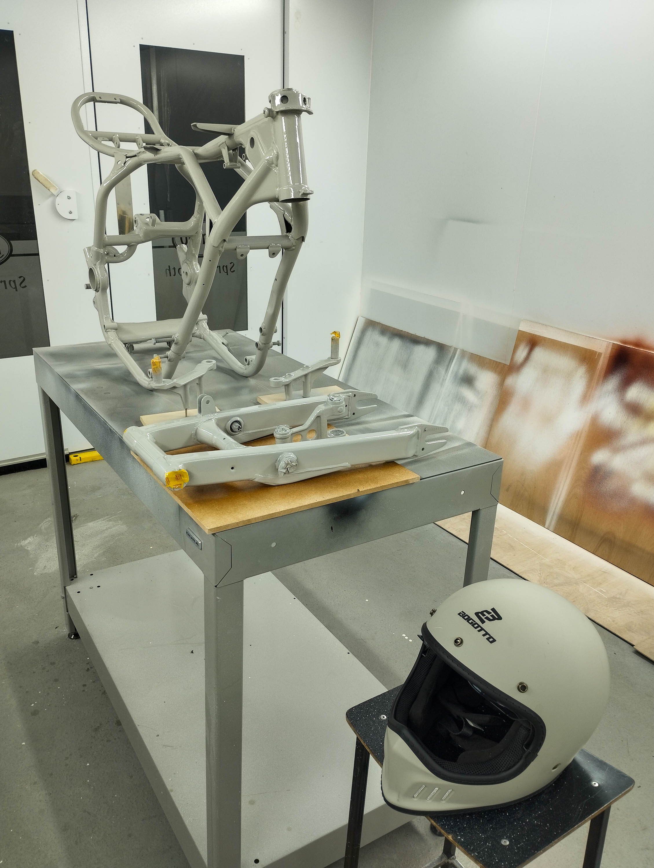 My practice working with 2K paint and advice from my uncle has paid off. I managed to paint on the frame. I colour matched the frame with the helmet… The colour seems to be really sensitive to light and texture. The colour is closer to a cooler light grey in outdoor light, however matt and gloss look like different colours. Thinking about clear-coating the helmet now to get a closer match.